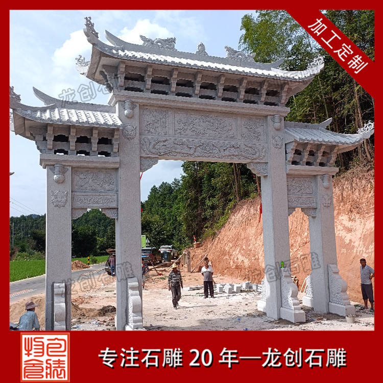 在很多的農村的村口都會有石雕牌坊,也有人稱石門樓,這是一種非常常見的建筑,村口石雕牌坊不僅僅是一個村子文化的象征,同時也是村子非常獨特的景觀,在不同的農村,石雕牌坊會有不同的設計,因此村口石雕牌坊樣式也具有多樣性。以下是村口三門石雕牌坊案例展示: