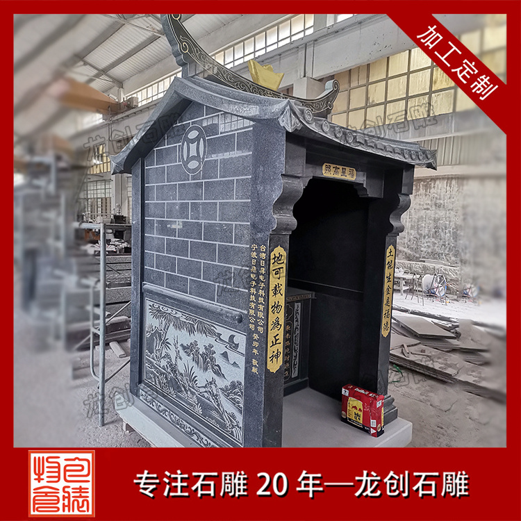 在浙江寧波的金蓮寺改造項目中,一座精美的石雕土地廟成為點睛之筆。這座土地廟采用優質芝麻黑654石材,質地堅硬,色澤溫潤。廟身的雕刻工藝精湛絕倫,高2.9米,寬1.36米,深度1.63米,整體造型古樸典雅,遵循傳統廟宇建筑風格,飛檐斗拱線條流暢,比例協調;墻體厚實,雕紋精美,線條流暢。其內部空間布局合理,土地神像安置其中,更顯威嚴。