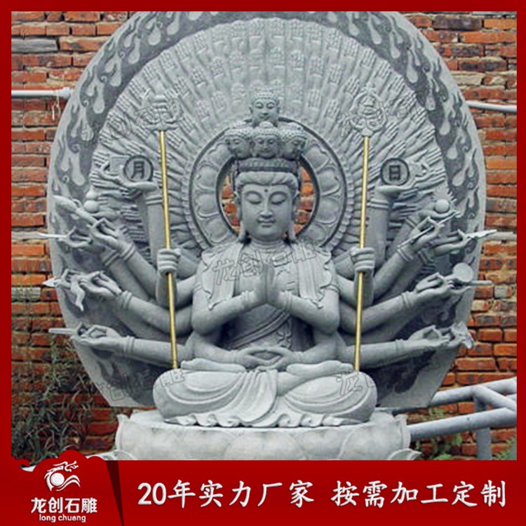 石雕千手觀音并不是真的有千手和千眼,我們常說的千手觀音代表著無邊之意,石雕千手觀音中的千手代表一千輪王,千眼代表一千尊佛,它的含義是觀世音菩薩的手多、眼多、智慧多、有求必應。