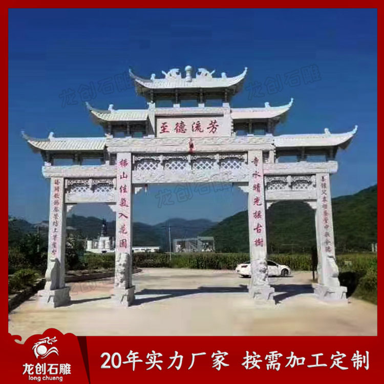 三門石雕牌坊在農村地區也是比較常見的,三門五樓牌坊定制也比較多,尤其是現代一些新農村建設中更是經常可以看到這類三門石牌坊設計的農村石牌坊。農村地區的牌坊通常起到了標志地名以及裝飾性作用,在實際雕刻的時候應當要考慮到農村地區的特色以及風土人情等情況,從而能夠雕刻出更為精致的石雕牌坊作品,展現牌坊的建筑之美。