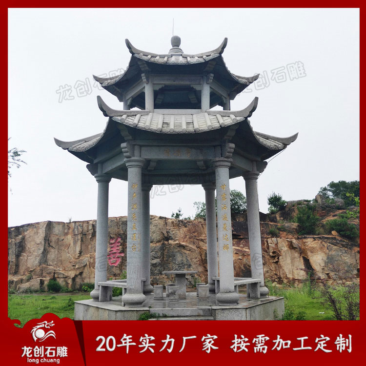 不管是四角石亭子還是六角石亭子,一般都為開敞性結構,頂部可分為四角,六角、八角、圓形等多種形狀。其材質多選用青石、花崗巖,晚霞紅等石材。泉州石亭子廠家,選惠安龍創石雕,專注石雕20年,支持按需定制。
