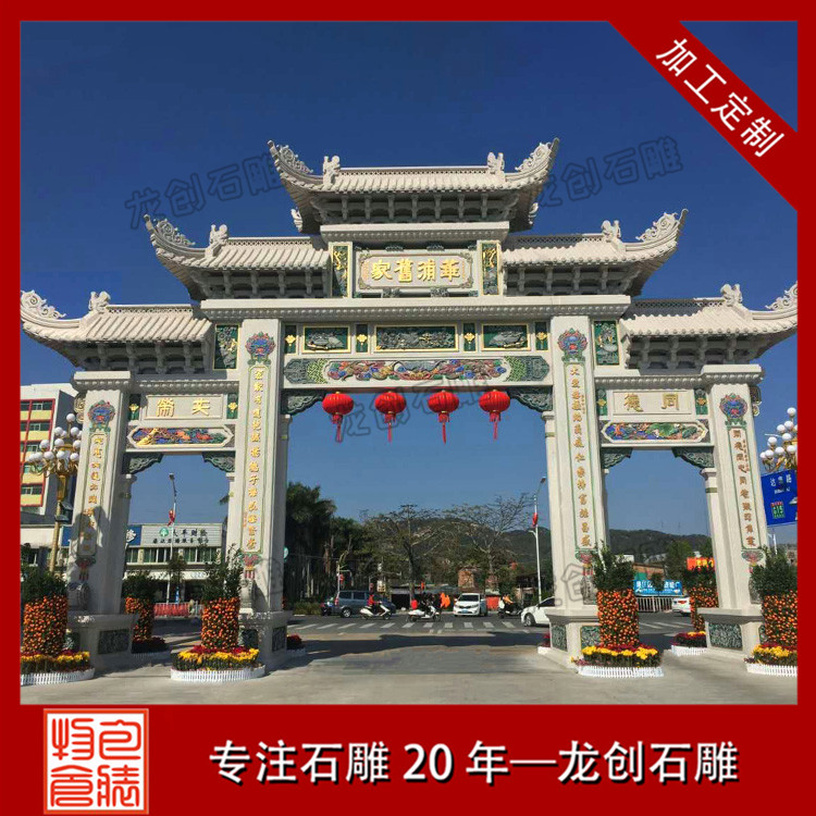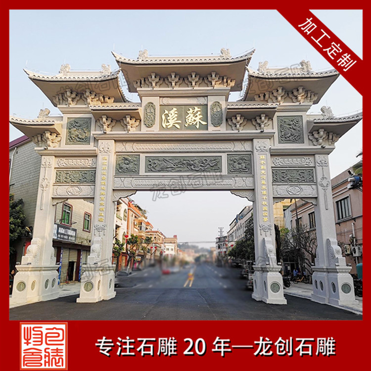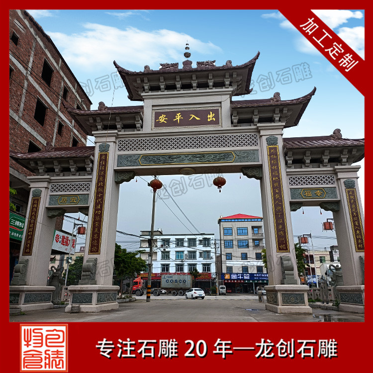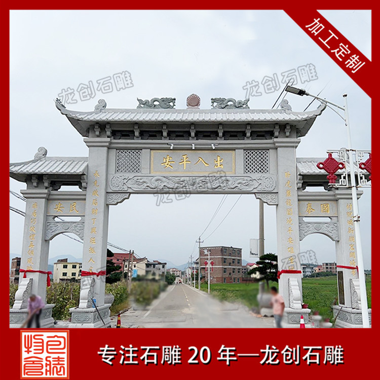 雕刻精美好看的中式景觀村口石牌樓,作為鄉村傳統文化中重要的組成部分,具有鮮明的地域性和文化性,對形成村莊格局和豐富鄉村空間形態,都產生了非常重要的影響。新村石牌坊、村口石牌樓是農村社會傳統文化的物質載體,記錄了農村地區的重要事件,同時也反映了新時期農民的思想道德觀念,以及對美好生活的期盼,也代表著新農村新形象。
