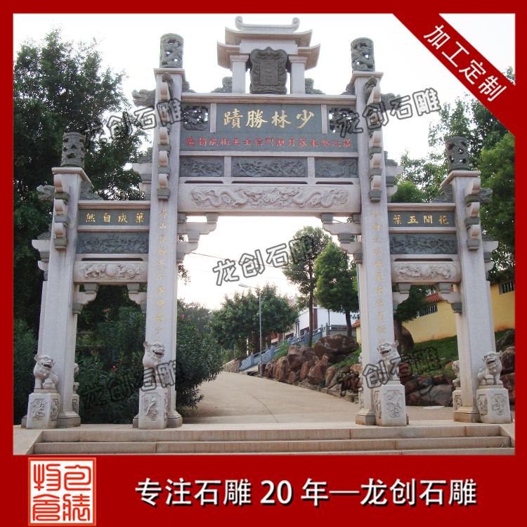 石牌坊廠家提供的高清寺院石牌坊圖片中,寺廟大門(mén)牌坊樣式眾多,常見(jiàn)的有一門(mén)三樓、三門(mén)三樓、三門(mén)五樓、三門(mén)七樓、五門(mén)五樓、九樓等樣式,從這里就能看出寺廟大門(mén)牌坊圖片樣式有很多,雕刻工藝精湛,外觀造型雄偉大氣,制作寺廟大門(mén)牌坊的材質(zhì)也越來(lái)越多,如青石、大理石、花崗巖、漢白玉、輝綠巖等多種天然石材都是現(xiàn)在制作寺廟大門(mén)常用的。